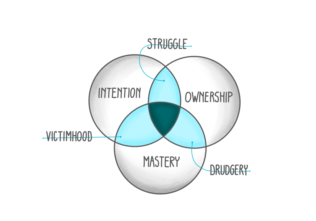 • In presence of Ownership and Mastery, but lacking Intention leaves you in a drudgery without a sense of purpose. You feel responsible, and you are capable to execute the work, but it leaves you emotionally empty as you go through the motion on autopilot.
